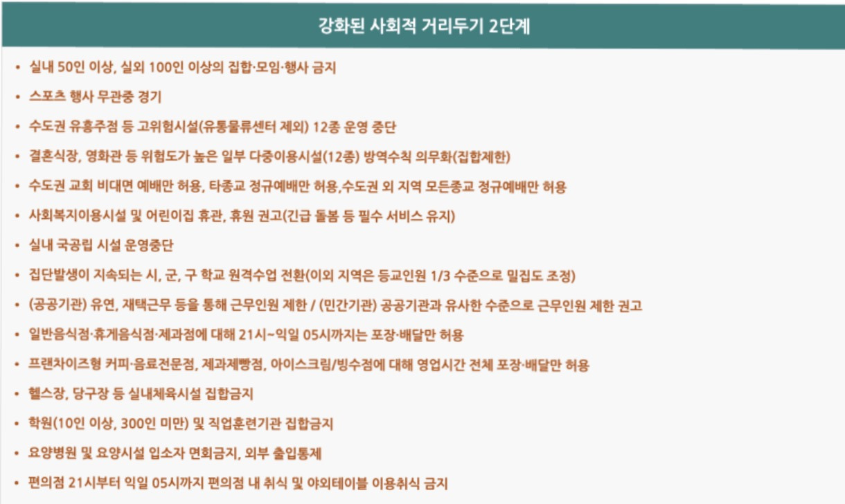 정부가 수도권의 사회적 거리두기를 2단계에서 2.5단계로 격상해 3주간 적용키로 한 데 대해 전문가들은 3단계 수준의 선제적 방역 조치가 필요하다고 지적했다. 오늘은 21년 7월부터 시행되는 새 거리두기 개편안 단계에 대해 살펴보려고 합니다. Nov 26, 2020 · 사회적 거리두기 3단계 기준 3단계 <전국적 대유행> 전국 주평균 확진자가 800명~1000명 이상이거나, 2.5단계 상황에서 더블링 등 급격한 환자 증가 상황, 격상시 60대 이상 신규확진자 비율, 중증환자 병상수용능력 등 중요하게 고려합니다. Dec 06, 2020 · 연합뉴스. 절반 넘는 사람이 현재의 코로나 상황을 심각한 것으로 보고 일상생활에 커다란 제약이 따르는 3단계 거리 두기에 긍정적인 답변을 한 겁니다.