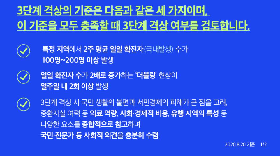 거리두기 3단계 기준은 전국 주 평균 확진자가 800~1000명 이상이거나, 2.5단계 상황에서 더블링 등 급격한 환자 증가 이다.